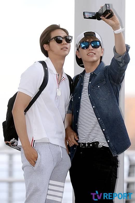 [T포토] 신우-산들 '출국길에 셀프카메라는 필수'