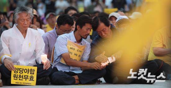 9일 오후 서울 광화문광장에서 열린 '광화문에서 외치다' 촛불 문화제에 참석한 세월호 희생자 단원고 유민이 아빠 김영오 씨(가운데)가 촛불을 켜고 있다.