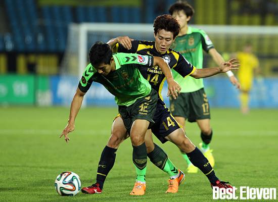 9일 저녁 경기도 성남 탄천종합운동장에서 현대오일뱅크 K리그 클래식 2014 성남 FC와 전북 현대의 경기가 열렸다. 전북이 카이오, 한교원, 이상협의 연속골을 앞세워 성남에 3-0 승리를 거두었다. 성남 전성호와 전북 이주용이 공을 차지하기 위해 치열한 몸싸움을 벌이고 있다.