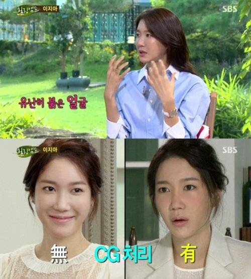 이지아는 "그때 제작진이 배려해준다고 컴퓨터 그래픽(CG) 처리를 해줬다. 유난히 붉은 얼굴이라 하얗게 처리를 해줬다. 상대방은 실사인데 나만 만화처럼 나왔다"고 설명했다.