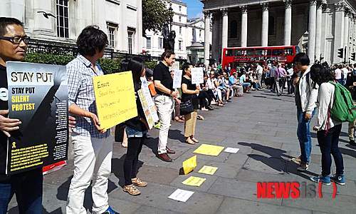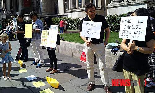 【뉴욕=뉴시스】노창현 특파원 = 영국 런던광장에서 세월호 희생자 추모와 특별법 제정을 촉구하는 시위가 16일 펼쳐졌다.