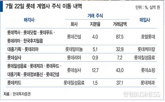 롯데칠성음료는 롯데상사로부터 롯데리아 지분 0.9%(72억 원)를 사들였다. 롯데제과는 롯데칠성음료 지분 1.5%(371억 원)를 롯데카드로부터 사들였다.