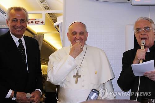 (교황 전세기=연합뉴스) 박성진 특파원 = 프란치스코 교황이 "세월호 유족의 고통 앞에서 중립을 지킬 수 없었다"고 세월호 유족에 깊은 관심을 보인 이유를 설명했다.