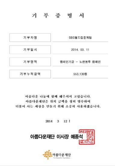 배성재랑 찬헌PD가 이 돈을 SBS 월드컵 중계팀 이름으로 노랑봉투캠페인에 기부를 했다는 것이다.