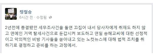 송혜교 소속사 공동설립자이자 법률대리인인 '더펌'의 정철승 변호사는 22일 페이스북에 올렸던 CBS 노컷뉴스 비방글을 스스로 삭제했다.