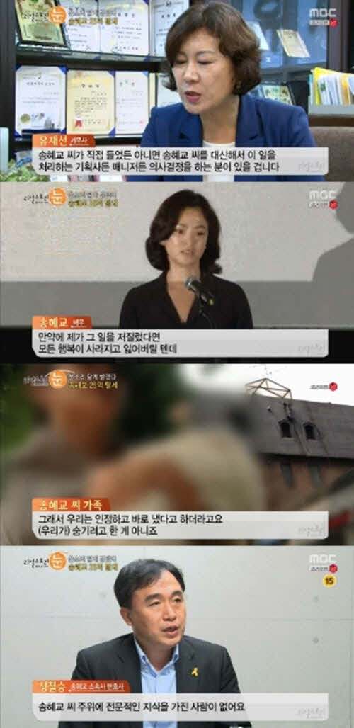 <리얼스토리 눈> 제작진은 탈세 의혹과 관련한 송혜교 가족의 입장을 듣기 위해 자택을 찾았다. 송혜교 가족은 "몰랐다가 국세청에서 탈세를 이야기해 깜짝 놀랐다. 전부 계산이 잘못되었다고 하더라. 인정하고 바로 냈다고 들었다. 숨기려고 한 것은 아니다"라며 "세금을 안 내지도 않았고 안 낼 의도도 없었는데 마치 세금을 안 낸 것처럼 보도됐다"라고 전했다.