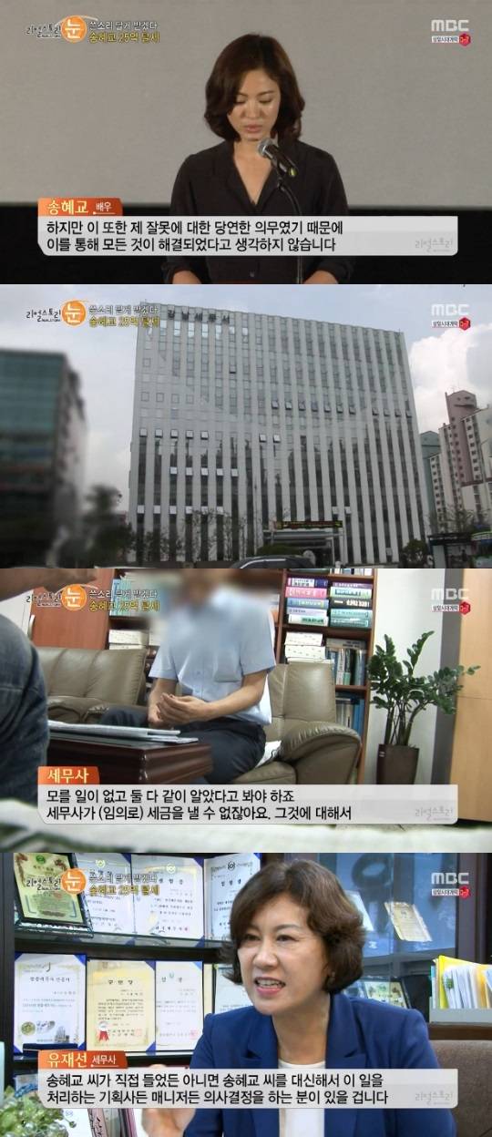 25일 방송된 MBC '리얼스토리 눈'에서는 배우 송혜교의 탈세 의혹에 대해 파헤쳤다.
