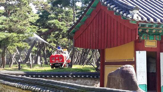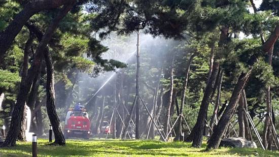 | ▲ 국가지정문화재 명승 제21호로 지정된 공주 고마나루 솔밭에 공주시가 살충제를 뿌리고 있다. |