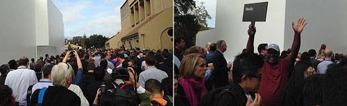 드디어 입장이 시작됐습니다. 애플은 미디어라고 특별대우를 하지 않았습니다. 그냥 모두가 줄을 서서 들어가는 분위기였습니다. 애플 이벤트는 항상 이랬다고 합니다. 샌프란시스코 시내에서 행사할때는 문이 열리기 전까지 줄을 서고 있다가 문이 열리면 일제히 뛰어들어갔을 정도라니까요. 애플은 행사 발표전까지 단 한가지의 내용도 미리 말하지 않기로 유명합니다. 신비주의 전략인지 모르겠지만 어쨌든 그게 애플이라는 기업의 색깔이기도 합니다.