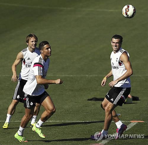 epa04396968 Real Madrid's Welsh midfielder Gareth Bale (R), Portuguese striker Cristiano Ronaldo (C) and Croatian midfielder Luka Modric in action during a training session in Madrid, Spain, 12 September 2014. Real Madrid will face Atletico Madrid in a Spanish Primera Division League's match at the Santiago Bernabeu stadium on 13 September 2014. EPA/SERGIO BARRENECHEA