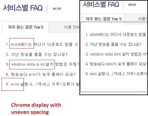 프론트엔드 엔지니어 윤원진 씨는 "크롬37 버전에 새 폰트 렌더링 방식이 적용돼 굴림, 돋움같은 한글 비트맵 폰트 렌더링에 문제가 생겼다"며 "영문, 한글, 숫자 모두 자간 계산이 달라졌다(왜곡됐다)"고 지적했다.