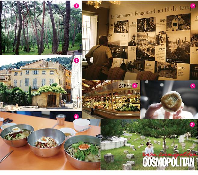 1.영월 청령포 소나무 숲고즈넉한 숲의 풍경이 아름답고 왠지 슬픈 느낌을 주었다. 울창한 소나무 사이로 걸을 수 있는 영월2.프랑스 그라스 향수박물관프랑스 그라스에 가면 한 번쯤은 들러야 하는 대표 향수 공장이자 박물관인 프라고나르의 내부. 향수와 공장의 역사를 알아보고 다양한 향수를 구입할 수도 있다3. 프랑스 콜마르 마을스위스와 독일, 프랑스의 느낌이 한데 섞여 있는 프랑스 콜마르 알자스 지방의 건물들. 아기자기한 동화 속 마을 같은 느낌을 준다4. 프랑스 콜마르의 실내 시장현지 농산물을 구경하거나 구입할 수 있다. 알자스 화이트 와인 가도의 중심지인 만큼 맛 좋은 화이트 와인과 치즈를 구입할 수 있는 로컬 시장이다5.경주 황남빵경주에 가면 몇 시간은 기다려 사 먹는 황남빵. 개인적으로는 경주찰보리빵을 더 좋아하지만, 처음 방문하는 사람이라면 꼭 맛보길 추천. 달지 않은 팥의 부드러운 맛이 일품이다6. 경주 밀면경주에 들르면 꼭 먹어봐야 하는 경주 밀면. 담백하고 특이한 국물 맛이 좋아 매번 찾게 된다. 온밀면, 비빔밀면, 냉밀면 중 한 가지만 먹고 오기엔 아쉬워 늘 세 그릇을 시키게 된다 7.영월국제현대미술관 당시 이곳에 방문했을 때는 조각가 박찬갑의 전시가 한창이었다. 초등학교를 개조해 만든 곳이라 아기자기하고 정겨우며, 야외 전시장은 잠시 숨을 돌리며 관람하기 좋다.