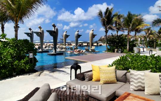 '더 물리아 오아시스풀'과 중앙 정원을 지키는 거대한 석상이 바라다 보이는 '솔레일' 레스토랑의 야외 식탁.