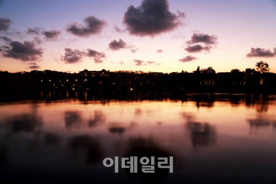 물리아발리 리조트 입구에서 바라본 '더 물리아'의 일몰 풍경. 리조트 입구 연못 위로 비친 일몰의 반영과 더 물리아의 조명이 더 은은하게 느껴진다.