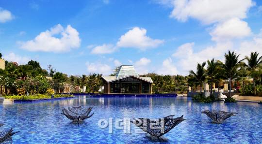 발발굽 형태로 만들어진 '물리아 리조트'와 중앙 정원을 지키는 거대한 석상. 시선의 끝에는 거대한 수영장과 인도양의 신비로운 수평선이 오버랩된다.