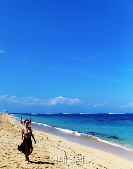 물리아 발리가 위치한 누사두아 해변을 걷고 있는 투숙객. 물리아 발리는 매년 유실되는 모래사장을 채우기 위해 모래를 외국에서 수입해 온다고 한다.