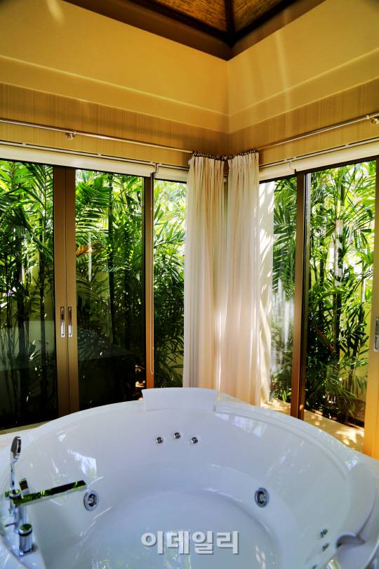 '물리아 빌라'의 객실 욕실. 빌라는 원 베드룸, 투 베드룸, 식스 베드룸까지 다양해 대갖고이나 소규모 그룹이 독립된 분위기를 만끽 할 수 있다.
