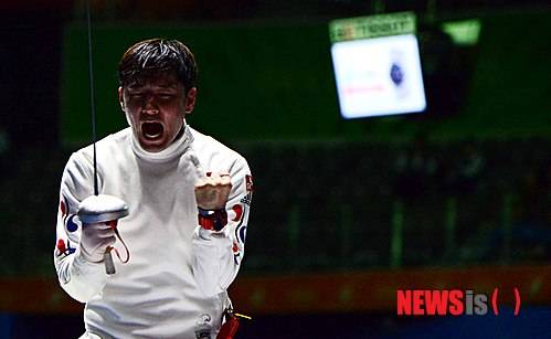 【고양=뉴시스】전신 기자 = 20일 경기도 고양체육관에서 열린 남자 펜싱 에페 개인전 8강에서 한국 정진선이 일본 미노베에게 15-11로 승리한 후 기뻐하고 있다. 2014.09.20.
