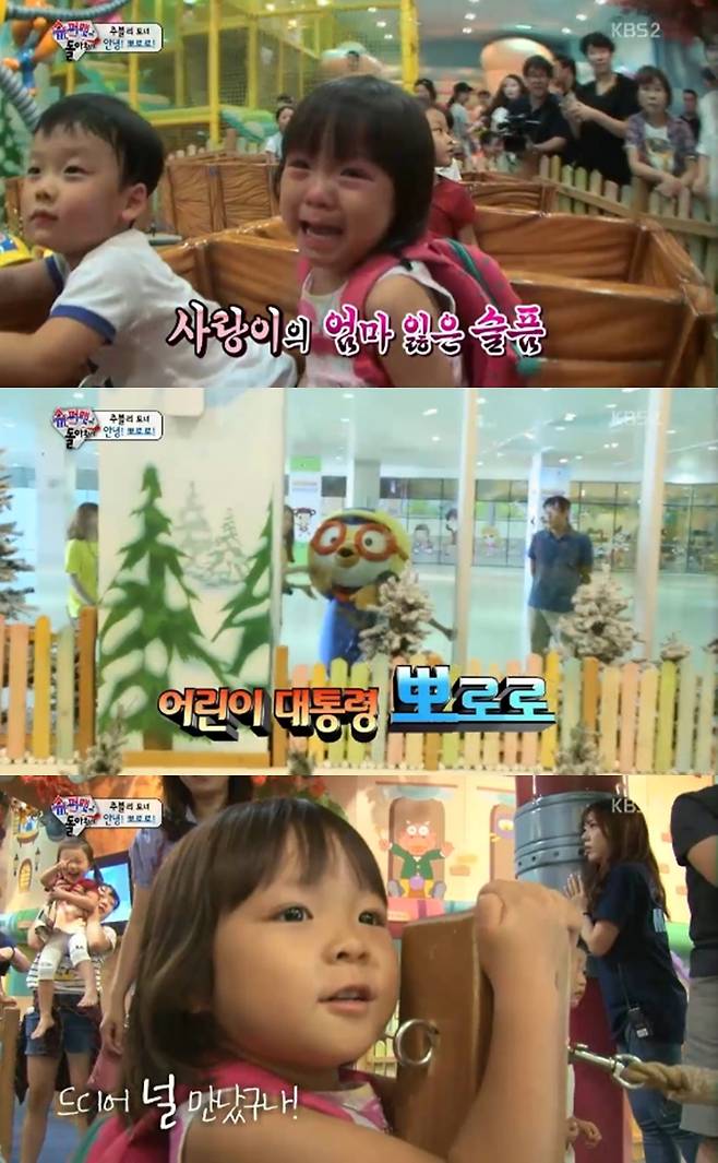 추사랑이 '해피선데이-슈퍼맨이 돌아왔다' 에서 뽀로로와의 만남에 함박웃음을 지었다.