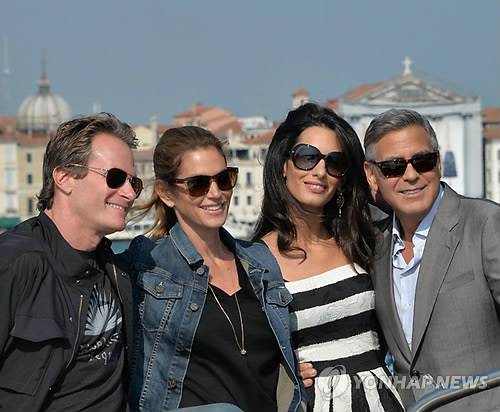 epa04418435 (L-R) US businessman Rande Gerber, compatriot model Cindy Crawford, Lebanese-British lawyer Amal Alamuddin and US actor George Clooney pose for a photographer on a taxi boat in Venice, Italy, 26 September 2014. According to media reports, the wedding of George Clooney and Amal Alamuddin is to take place in Venice this weekend. EPA/ANDREA MEROLA