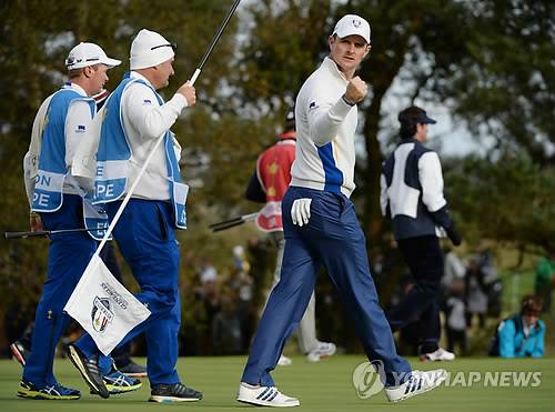 epa04419995 Europe's Justin Rose reacts after sinking a putt on the 8th green during his Fourball match against Bubba Watson and Matt Kuchar on the second day of the 40th Ryder Cup at Gleneagles, Perthshire, Scotland, 27 September 2014. EPA/ANDY RAIN