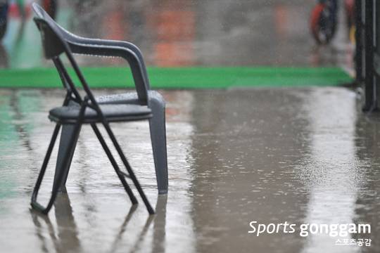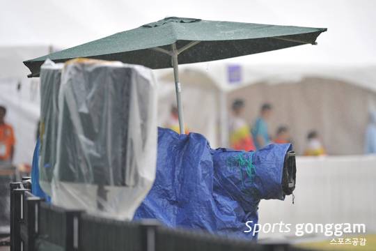 비가 잦아드는 것 같아 경기를 재개했지만 경기 시작 직전에 빗줄기가 굵어지자 심판도 고민이 많은 듯 했다.