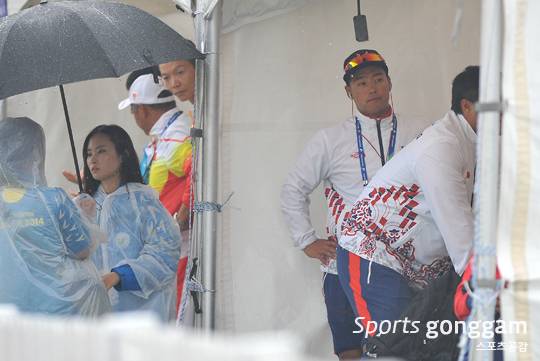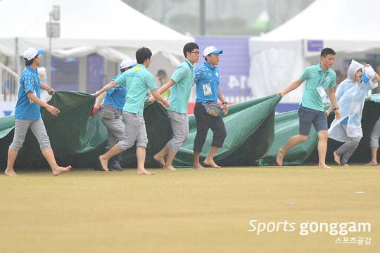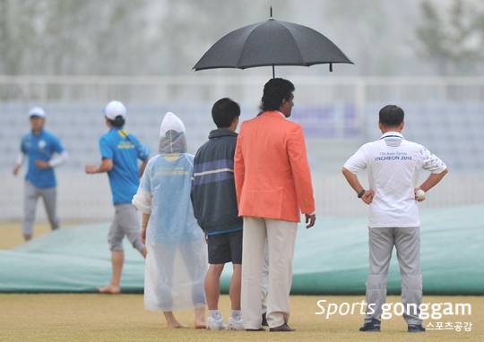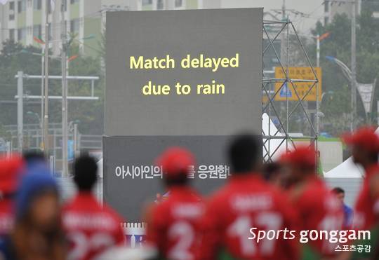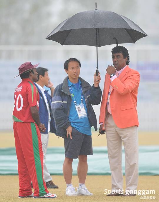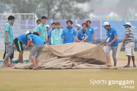 2시에 예정된 조별리그 B조 한국과 중국의 경기는 현재 우천으로 경기가 지연된 상태이며 만약 경기가 재개되지 못할 경우 한국팀 역시 동전 던지기로 승자를 결정하게 된다. 내리는 비가 야속한 인천 연희크리켓경기장이다.