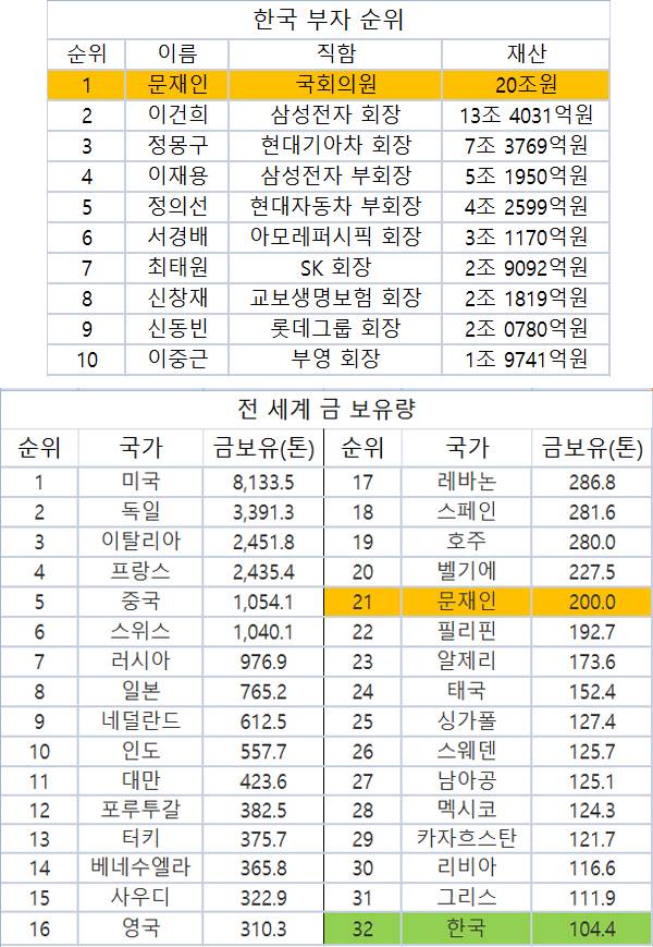예를 들면 '한국 부자 순위'를 문재인이 재산 20조원으로 이건희 삼성전자 회장(13조4031억원)을 누르고 1위에 올랐다든지, '전 세계 금 보유량'에서 문재인은 200t으로 당당히 21위에 올랐습니다. 금 104.4t을 보유한 한국은 32위에 그쳤군요. 또 인터넷에는 문재인을 세계적인 부자 만수르에 빗대 '문수르'라고 부르기도 합니다.
