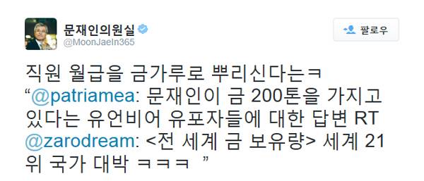 문재인의원실이 29일 이 패러디물을 활용한 트윗을 날렸습니다. 의원실은 '문재인이 금 200톤을 가지고 있다는 유언비어 유포자들에 대한 답변'이라는 글과 함께 패러디 사진을 남긴 조국 서울대 교수의 트윗을 퍼올리면서 '직원 월급을 금가루로 뿌리신다는ㅋ'라고 적었습니다.