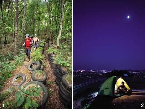 ↑ [월간산]1 것고개 북쪽 한남정맥에 구축된 군 교통호. 2 문수산정의 8월 밤하늘. 둥근 달 아래 김포시와 서울시가 반짝이고 있다. |