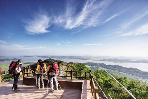 정상 너머 안부는 더할 나위 없는 야영지였다. 예전 군부대 자리였다는 안부에는 널찍한 데크가 깔려 있고 평상에 앉은뱅이의자와 작은 식탁까지 갖추고 있어 편안히 앉아 강화 야경을 눈요기삼아 저녁 성찬을 즐기기 그만이었다. 강화도는 밤바다에 떠 있는 거함처럼 우리를 황홀경 속으로 밀어 넣고 밤하늘은 멋지고 꿈결 같은 풍광을 보여 주었다.