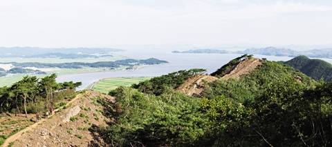 북녘 땅도 푸르렀다. 하지만 숲은 보이지 않았다. 평지는 벼가 자라는 푸르른 농경지요 산은 우거진 잡풀이 푸른빛을 띠었다. 그 뒤편 멀리 제법 기운찬 산봉 산릉이 솟구쳐 있다. 굵은 산릉은 분명 예성강과 임진강을 가르는 임진북예성남정맥이요, 개성 쪽에서 가장 높은 봉우리는 개성 송악산(松岳山·488m)이 아닌가 싶다. 강 건너 마을이요 강 건너 산이건만 갈 수 없다는 현실이 가슴 저려왔다.