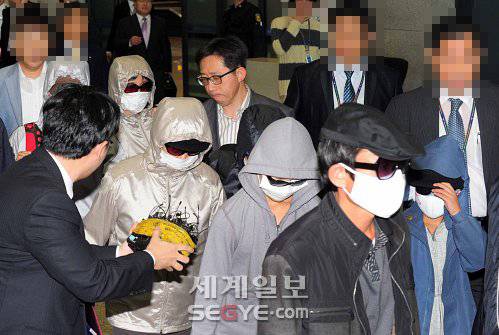 | 탈북자 9명이 모자 또는 후드티, 선글라스와 마스크로 얼굴을 가린 채 인천국제공항을 통해 입국하고 있다. 세계일보 자료사진 |