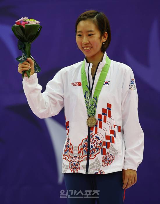 제17회 인천아시아드게임 여자 탁구 단식 시상식이 4일 수원 실내체육관에서 펼쳐졌다. 동메달을 수상한 양하은이 메달을 들고 포즈를 취하고 있다.