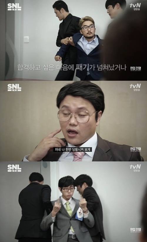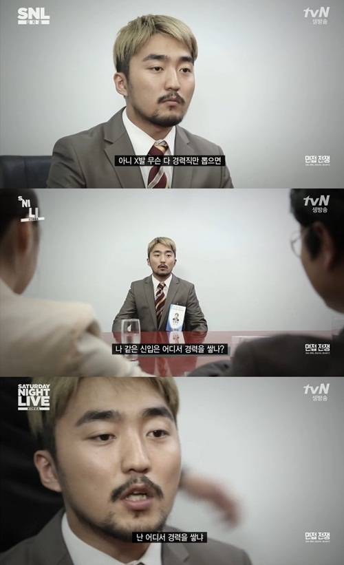 4일 방송된 tvN 예능 'SNL 코리아 시즌 5'(이하 SNL 코리아)의 '면접전쟁'에서 유병재가 경력직만 채용하는 일부 기업에 일침을 가했다.