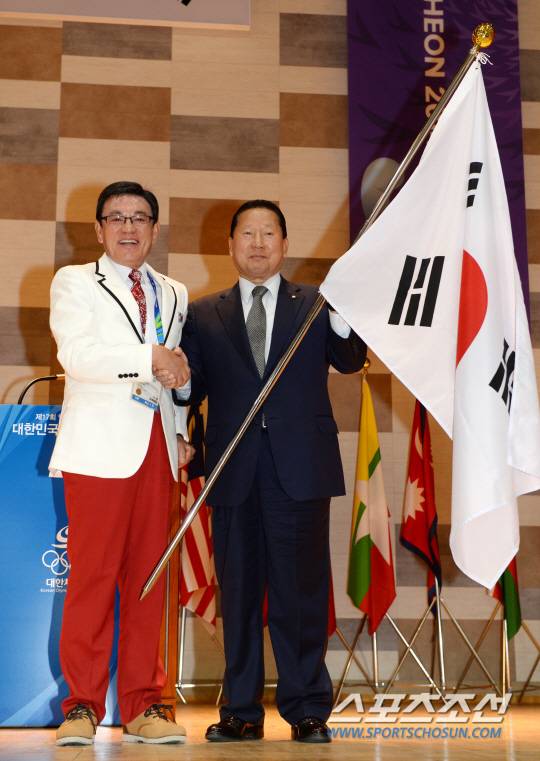 2014 인천아시안게임에서 금메달 79개, 은메달 71개, 동메달 84개를 따내며 5회 연속 종합 2위를 지켜낸 대한민국 선수단의 해단식이 5일 인천 구월아시아드선수촌에서 열렸다. 김정행 대한체육회장이 박순호 선수단장에게 단기를 넘겨받고 있다.