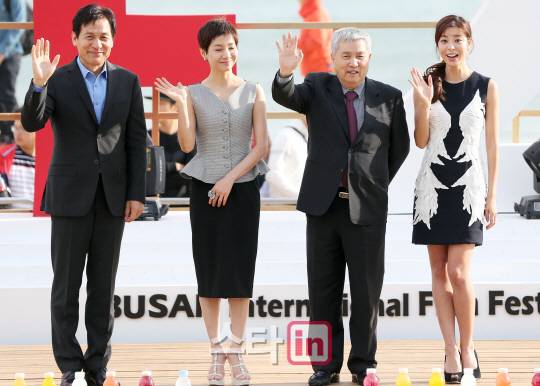 [부산=이데일리 스타in 방인권 기자] 배우 안성기와 김호정, 임권택 감독,김규리(왼쪽부터)가 5일 오후 부산 해운대 비프빌리지에서 열린 영화 '화장' 야외 무대인사에서 포토타임을 갖고 있다.