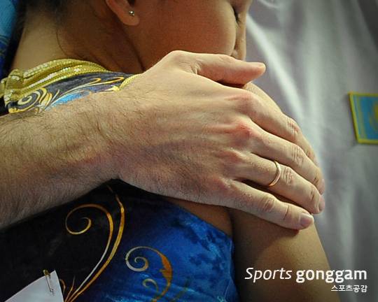↑기계체초 여자단체전에 출전한 카자흐스탄 바우이르자노바 아이다와 그녀를 위로하는 코치
