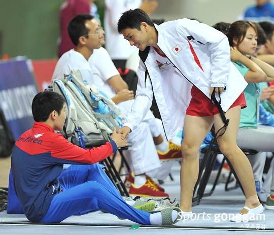 트램펄린 국가대표 이민우에게 누군가 악수를 건넨다. 일본 대표팀 선수였다.