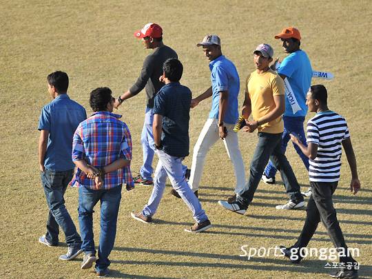 자칫 위험한 상황이 연출될 수도 있었지만 난입이라는 표현이 무색할 정도로 착한 스리랑카 팬들이었다. 위의 사진은 선수를 안전요원이 있는 벤치 안으로 밀어넣는 모습이다.