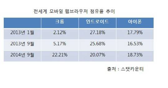 크롬은 지난해 1월 등장한 후 점유율 2%, 203년 9월 5,17% 점유율에 그쳤지만, 불과 2년 만에 모바일 웹브라우저 시장을 장악했다. 크롬 점유율이 높아진 것은 지메일 계정을 통해 쉽게 PC와 즐겨찾기, 부가 정보 동기화가 되고, 기본 브라우저에 비해 다양한 기능을 제공하기 때문이다. 또, 구글 레퍼런스 기기 등에 크롬이 기본 탑재되면서 사용자가 늘고 있다.