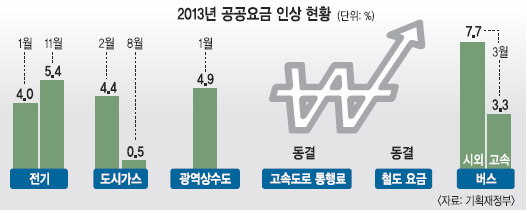 ◇내년 공공요금 들썩이나=올해는 5대 공공요금 중 도시가스만 소폭 올랐다. 도시가스요금이 원가변동제가 적용되는 만큼 인위적인 인상은 없었던 셈이다. 그러나 "원가에 거품이 있는지 살펴보겠다"던 현오석 전 부총리의 지시로 시작된 원가분석 결과 이들 공공요금은 '밑지고 파는 장사'임이 확인됐다. 수십조원의 부채에 시달리는 해당 공공기관들이 내년에는 요금 현실화를 강력히 주장할 가능성이 높다. 특히 전기요금의 경우 인상 압력이 거세다. 내년 1월부터 온실가스 배출권 거래제가 시행되면 발전사에서 배출권을 구입해야 하는 비용이 발생하기 때문이다. 지난 7월부터 발전에 이용되는 유연탄에 개별소비세가 부과됐지만 아직까지 요금에 반영되지 않은 것도 변수다. 4대강 사업 부채에 시달리고 있는 수자원공사도 상수도요금 인상을 내심 바라고 있다. 5대 공공요금에는 포함되지 않지만 정부는 광역급행버스인 M버스 요금 인상을 검토 중이다. 현재 M버스 요금은 30㎞까지는 기본요금(경기 2000원, 인천 2200원)이 적용되고 5㎞당 100원이 추가된다. 최근 입석 금지 조치로 인해 버스회사의 적자폭이 커질 것으로 예상되자 업체에서는 기본요금 1000원 인상을 요구하고 있다. 정부는 M버스의 원가보상률을 검증한 뒤 인상 여부를 최종 결정할 방침이다.
