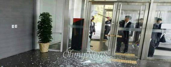 | ▲ 지난 4월 22일 인제스피디움 운영권을 둘러싸고 (주)태영건설과 분쟁을 벌이고 있는 (주)코리아레이싱페스티발에 용역 30여명이 들이닥쳐 해머와 각목 등으로 출입문을 부수고 있다. 이날을 포함해 총 두차례 용역 30여명을 동원해 폭력을 행사한 혐의로 SBS 윤석민 부회장 측근인 김아무개(49) (주)인제스피디움매니지먼트 상무가 10월 13일 구속 기소됐다. (사진 : 코리아레이싱페스티발 제공) |