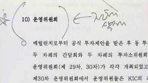 더 큰 문제는 이같은 투자가 이뤄지기 직전 당시 대통령직 인수위에 사전 보고됐지만 이후 한국투자공사의 특별감사에서 사전 보고 사실이 통째로 삭제됐다는 점입니다. 2008년 국정감사에서 당시 최경환 한나라당 의원이 강하게 성토했고 투자공사는 2009년 1월 자체 특별감사에 착수해 1차 보고서를 작성합니다. 이 보고서에는 투자 결정 이틀 전 한국 투자공사 사장과 재정경제부 관료들이 대통령직 인수위를 찾아가 강만수 인수위원과 최중경 인수위원에게 보고한 것으로 돼있습니다.