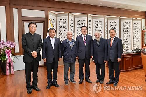 (서울=연합뉴스) 정의화 국회의장, 새정치민주연합 우윤근 원내대표, 새누리당 이정현 최고위원이 16일 국회에서 남수단에서 찾아온 원선오 신부(Fr. Vincezo Donati , 1928년생)와 공민호 수사(Br.James Comino, 1939년생 )를 만나고 있다.