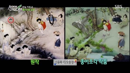 16일 오후 방송된 SBS '순간포착 세상의 이런 일이'는 가위를 이용해 종이 아트를 펼치는 '만능 가위 손' 송훈씨의 사연이 소개됐다. 세상에 이런 일이는 풍속화가 신윤복의 단오풍정 그림을 송씨가 제작한 종이조각 작품과 비교했다. 그런데 원작으로 소개된 단오풍정 그림에 노 전 대통령의 얼굴이 합성돼 있었다. 일베에서 노 전 대통령을 비하하기 위해 만든 악의적 이미지가 또 방송을 탄 것이다.