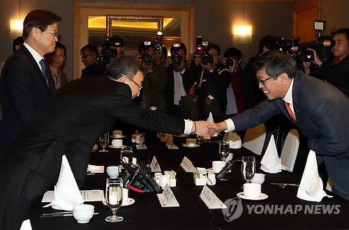 (서울=연합뉴스) 이지은 기자 = 최성준 방통위원장이 17일 오전 서울 서초구 반포동 JW메리어트호텔에서 가진 이통3사와 휴대전화 단말기 제조사 사장단과의 간담회에서 하성민 SK텔레콤 사장과 인사를 나누고 있다. 최양희 미래부 장관과 최성준 위원장은 이날 단통법 시행과 관련한 협조를 당부했다. 2014.10.17