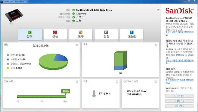 샌디스크가 울트라 II의 출시를 앞두고 많은 준비를 했다고 느껴지는 또 한가지 요소는 바로 전용 소프트웨어인 샌디스크 SSD 대시보드(SanDisk SSD Dashboard)의 지원이다. 사실 샌디스크의 SSD는 하드웨어는 쓸만하지만 소프트웨어 지원이 좀 빈약하다는 지적을 받곤 했는데, 대시보드의 지원으로 이를 보완하고자 하는 의지가 보인다.