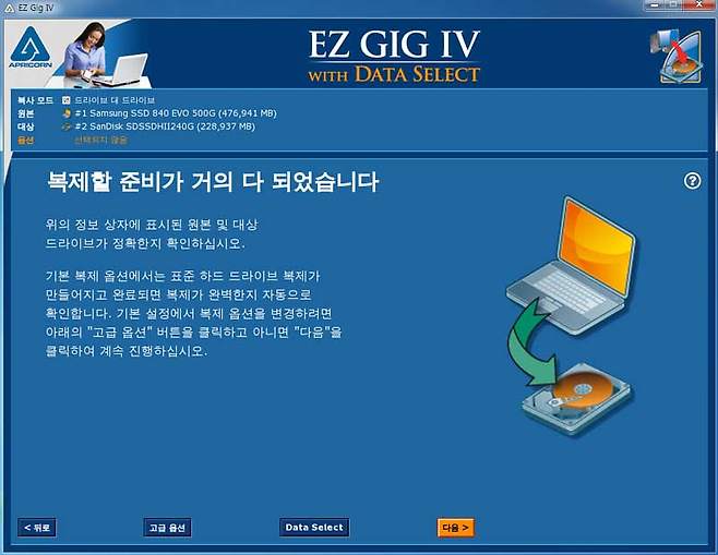다만, 샌디스크 SSD 대시보드 자체에 마이그레이션 기능이 있는 것은 아니고 대시보드의 '도구' 탭에 연결된 APRICORN의 EZ GIG IV 응용프로그램을 통해 마이그레이션을 한다(인터넷 연결 필요). 기존 저장장치로 구동되던 PC에 샌디스크 SSD를 연결한 후 EZ GIG IV을 구동, 화면의 지시에 따르기만 하면 누구라도 간단히 데이터 복제가 가능할 것이다. 이 작업이 끝나면 이전 저장장치를 떼어내고 샌디스크 SSD 만으로 부팅이 가능하다. 다만, 2개 이상의 SATA 포트를 가진 데스크톱이라면 문제가 없지만, 노트북은 1개의 SATA 포트만 있으므로 이 때는 SATA-USB 변환 케이블이나 외장하드 케이스가 필요할 것이다.