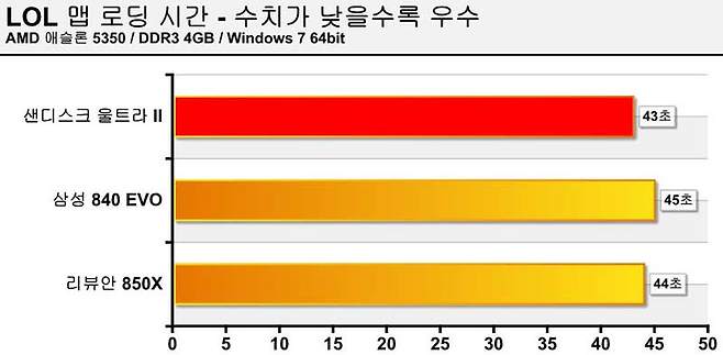 이번에도 세 제품 모두 거의 오차범위 수준으로 비슷한 성능을 발휘함을 알 수 있었다. 다음은 응용프로그램 실행속도를 측정하기 위해 온라인 게임인 리그오브레전드(LOL)을 구동, 게임 시작 버튼을 누른 후 본 게임이 시작될 때까지 걸린 로딩 시간을 측정했다.